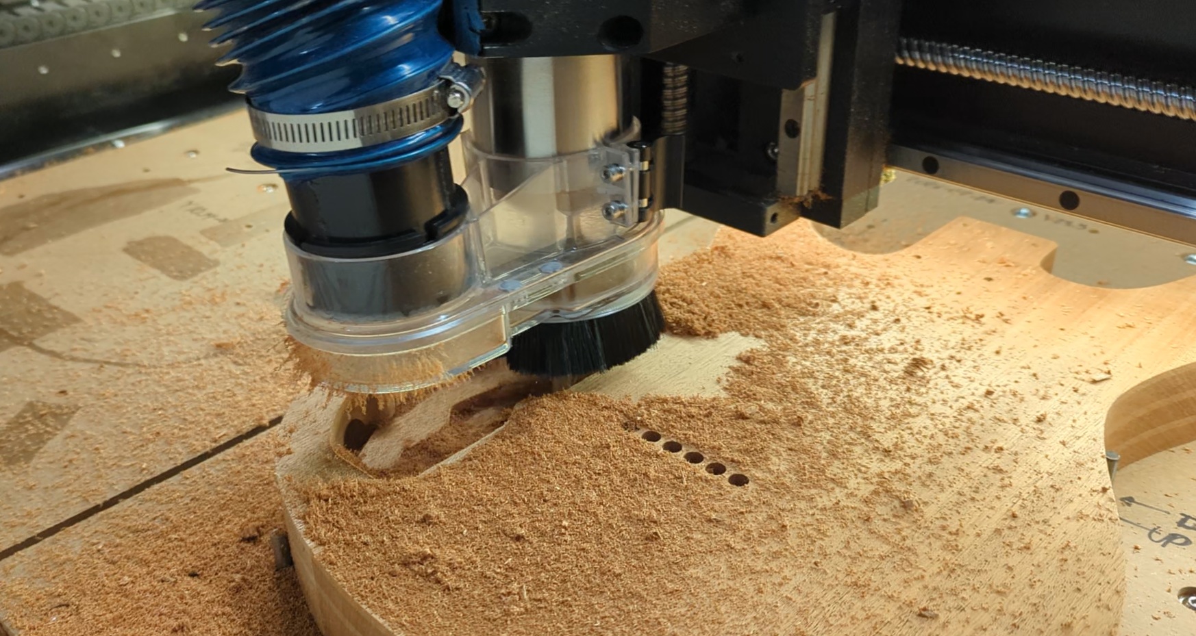 After decades of building guitars by hand I've decided to revisit my roots in the guitar making field and adopt a small shop CNC. After a few recent builds I came to the realization that my mind works faster than my hands. I have a backlog of unbuilt designs for guitars and parts going back almost 30 years, plus a stream of new ideas. I'm a perfectionist and spending hours making high precision templates for every variation in pickup and control layouts, scale, inlay, or nut width just wasn't sustainable. Add to that the physical wear and tear on the hands and shoulders and it just doesn't make sense to spend hours cutting fret slots or carving body contours by hand anymore. For many guitarists the word CNC conjures an image of mass producton factories churning out thousands of identical pieces. Its not unusual for builders myself included to promote their instruments as handmade. Yet unless youre talking about acoustics, that almost always still means built with handheld power tools. I can't imagine anyone cutting a solidbody shape out with a handsaw or hand planing the glue faces of laminate top. CNC is just another much more advanced power tool controlled remotely from a keypad. Theres no magic button you still have to know how to design and construct it. So for me its a way to bring new ideas to life much faster and more predictably than ever before. Want your body with smaller contours or the volume knob moved a 1/4"? No problem! This is where a small scale CNC in the hands of an experiencd luthier shines. For my entire building career I've meticulously drawn all my designs in CAD then printed them full scale and machined templates form MDF and acrylic. So the transition has a big headstart. Here's a shot of the machine in action cuting an N2 rear control cavity. Still makes a load of sawdust to cleanup! Other body designs and necks are in the works...More to come..stay tuned!